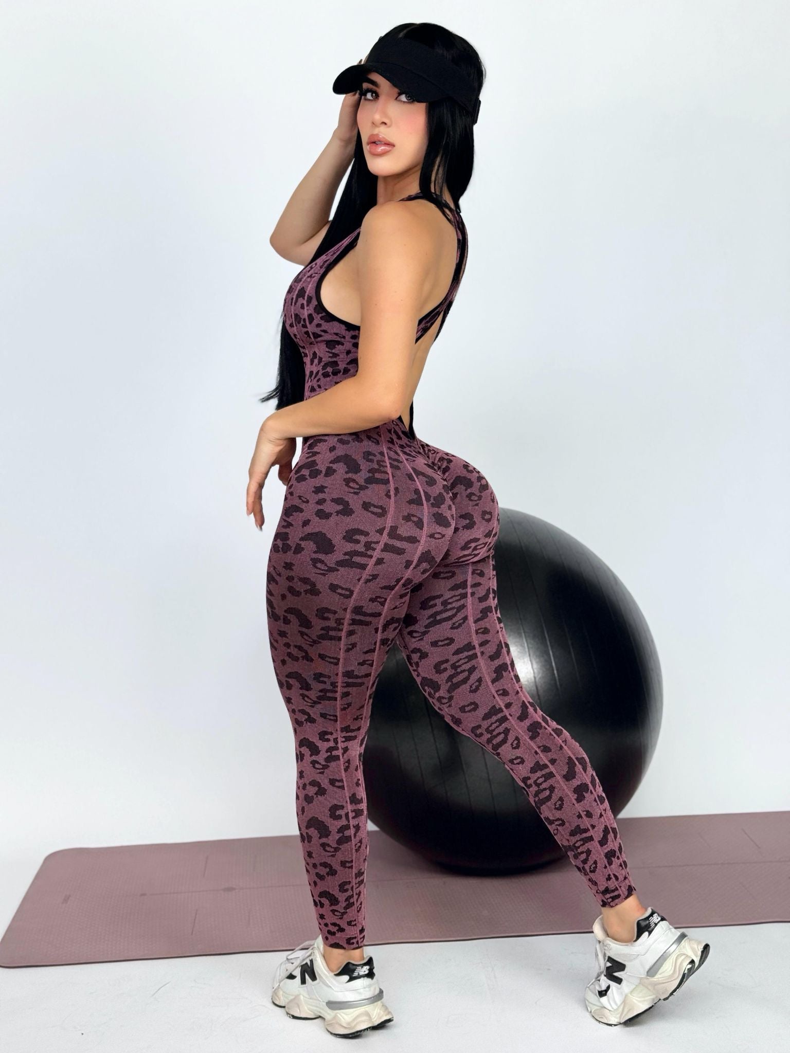 Este enterizo con estampado de leopardo destaca por su escote cruzado en la parte alta de la espalda. Su diseño incluye scrunch en la zona de los glúteos para realzar la silueta. Fabricado en una mezcla de 65% nylon y 35% poliéster, ofrece una textura suave con un sutil brillo que se ajusta perfectamente al cuerpo. Disponible en talla única.